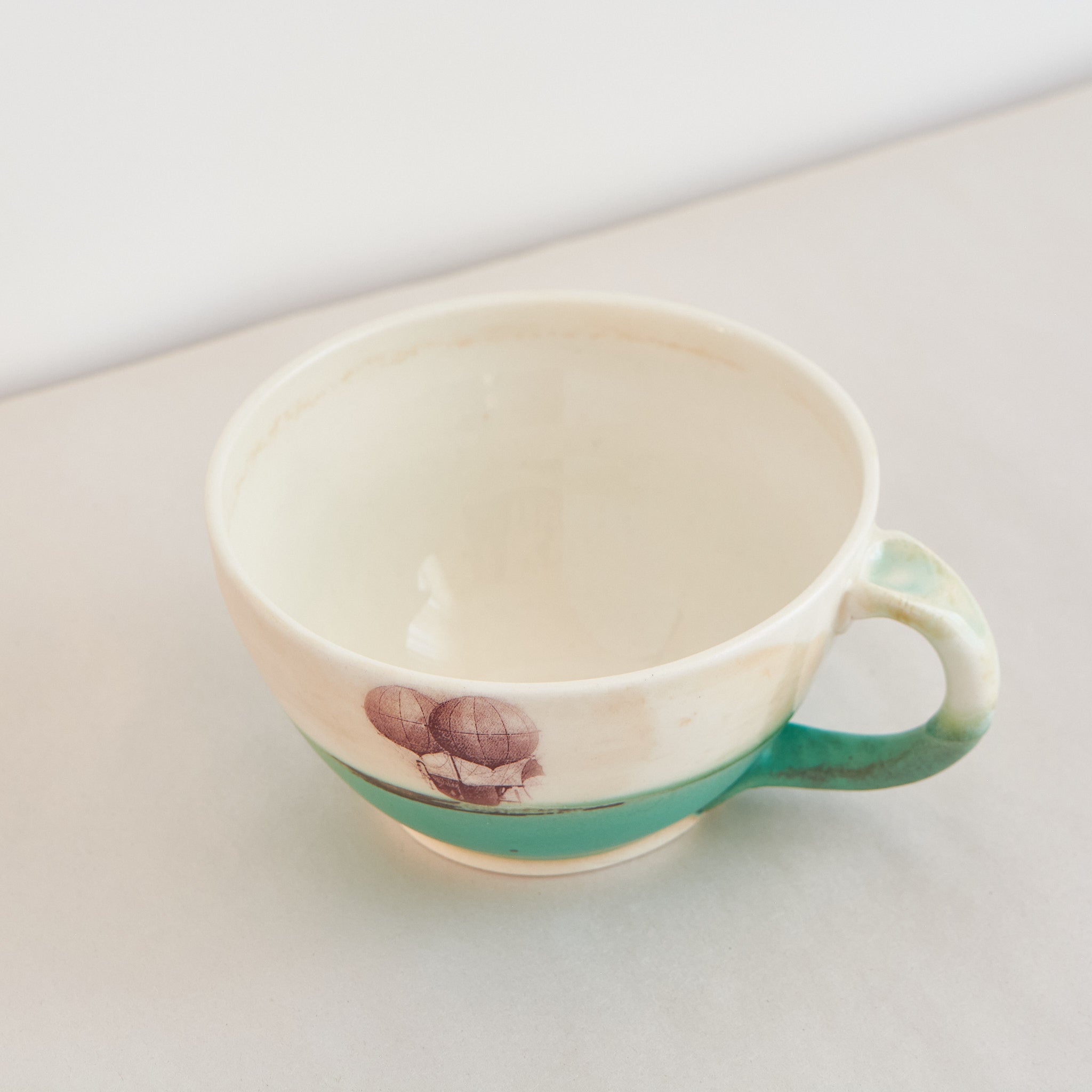 The transparent glaze is soft on the lips and smooth to the touch. This piece is part of a reflection on our relationship to time. Catherine uses the compass rose and the hot-air balloon boat to instill a lightness of being and reverie.