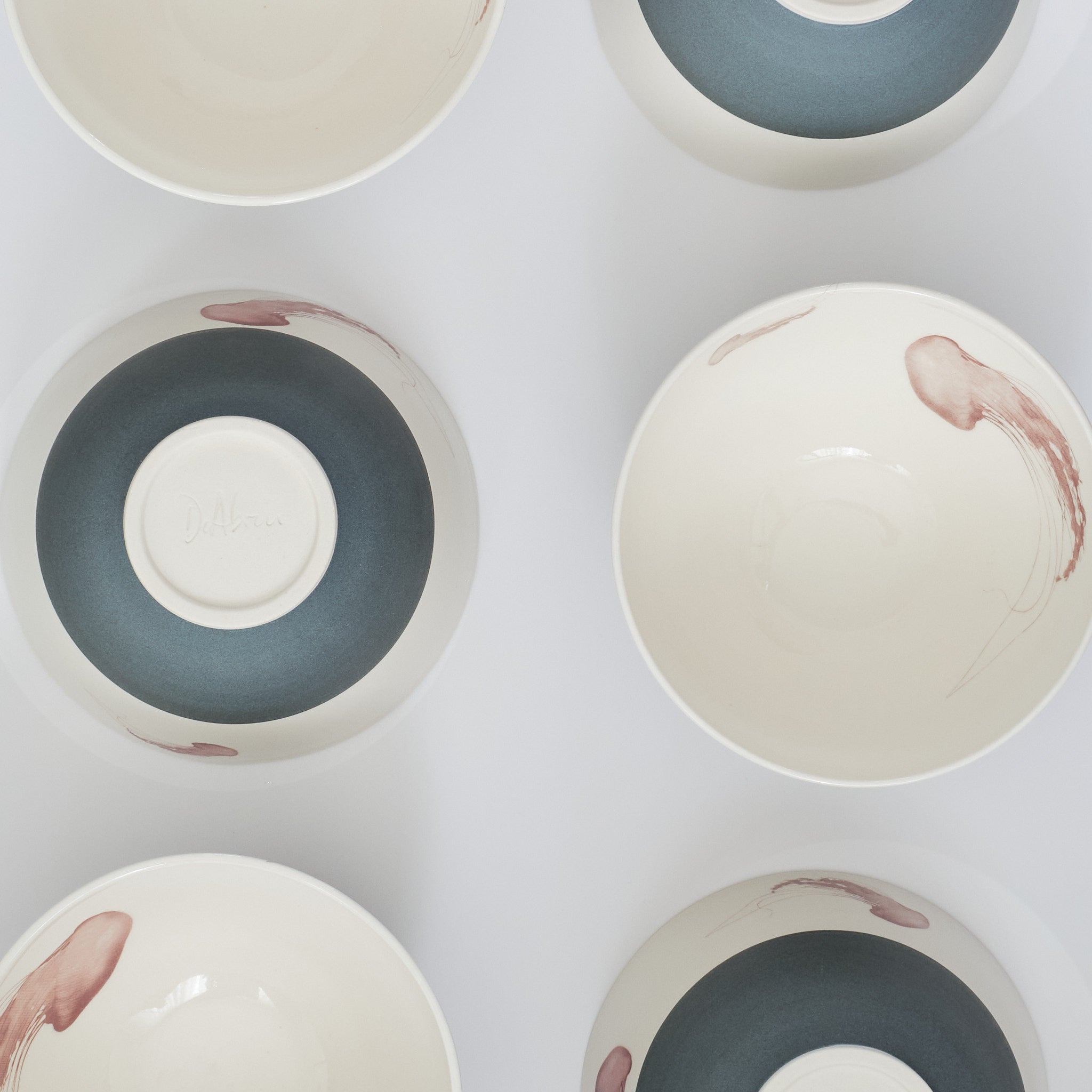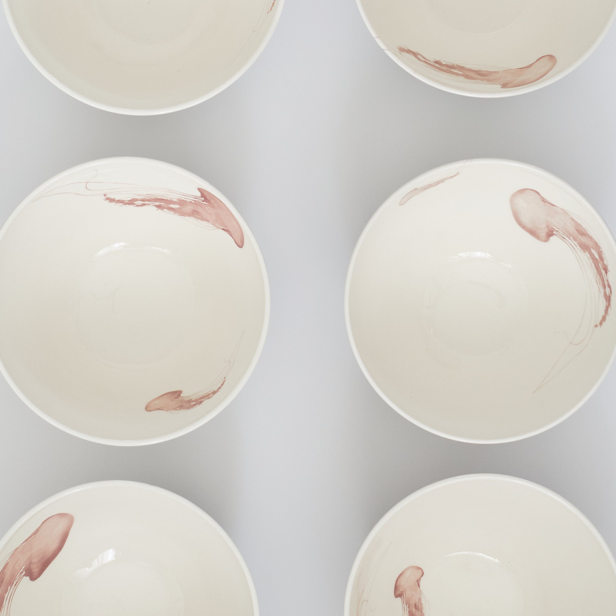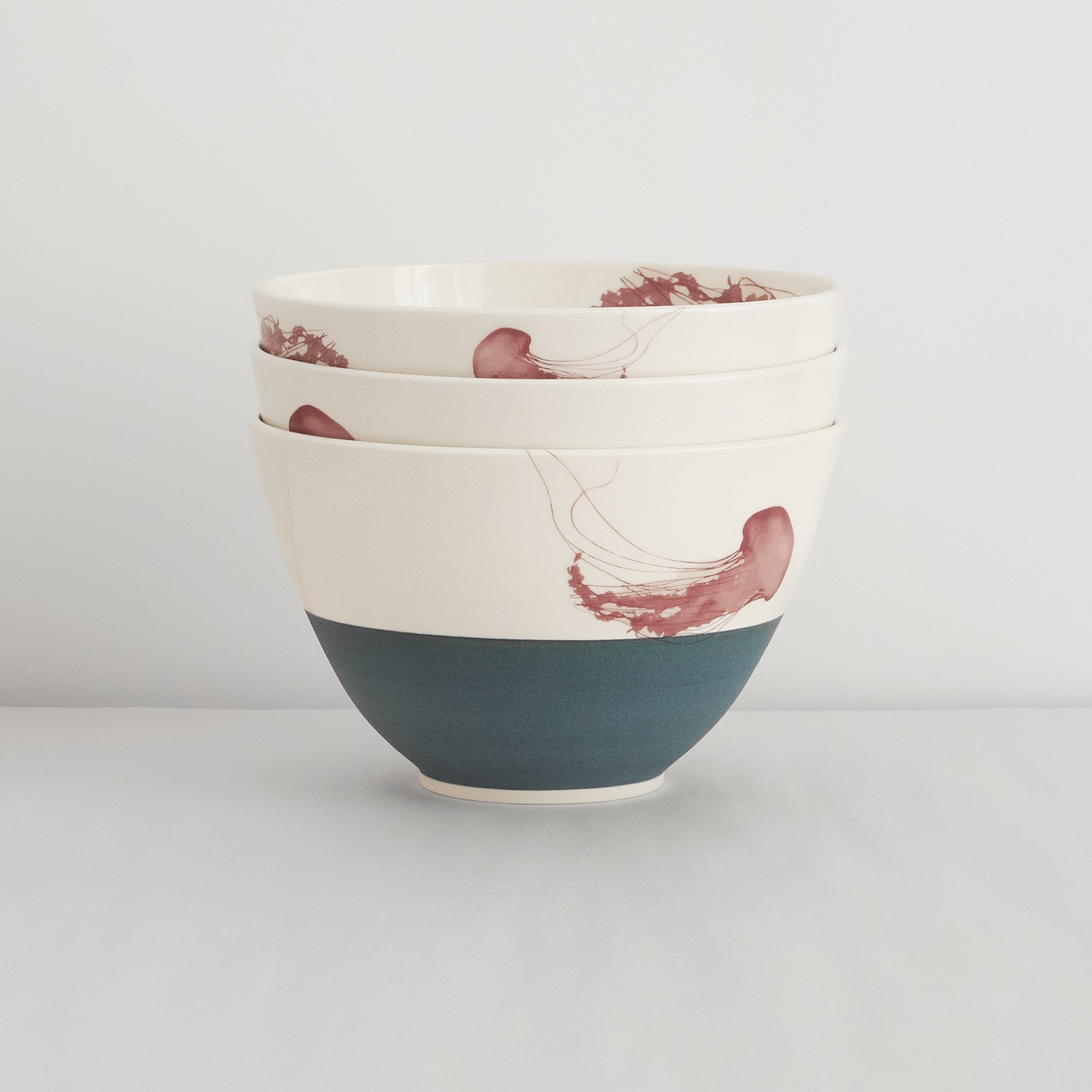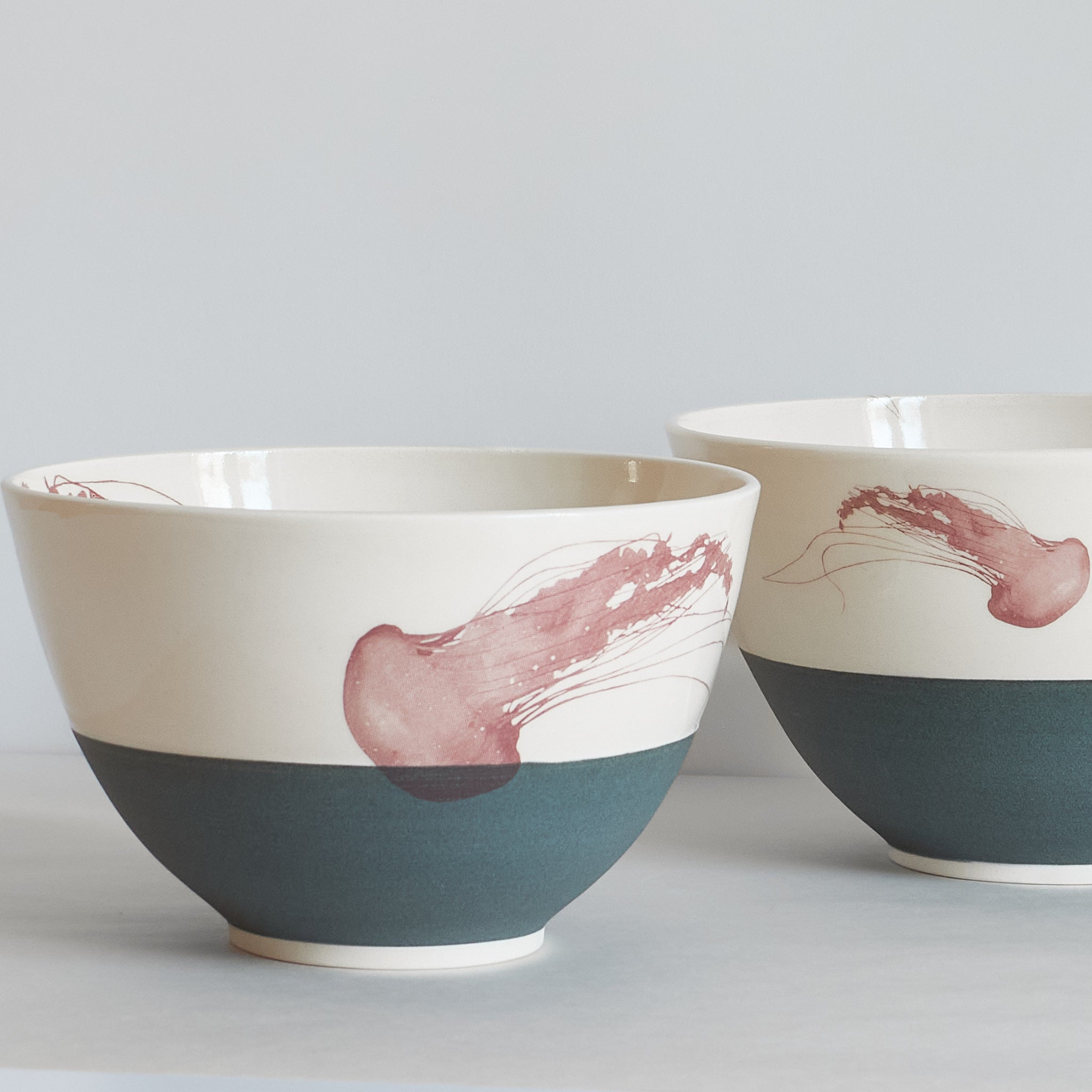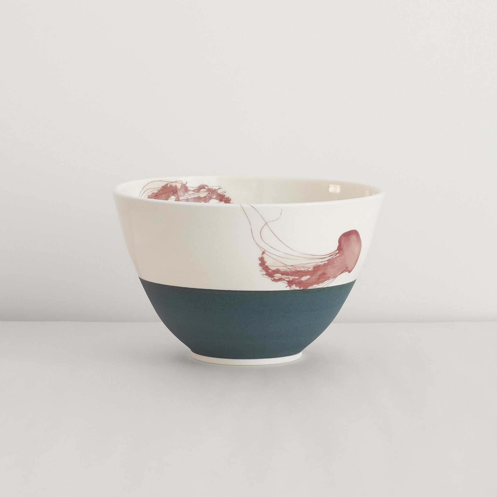 Catherine plays with textures that echo the natural world by contrasting a smooth interior with a coarser, anchor-grey exterior. The jellyfish drift across bowls, creating a whimsical feeling of being at sea. Each bowl is unique and made by Catherine on the potter's wheel using porcelain.